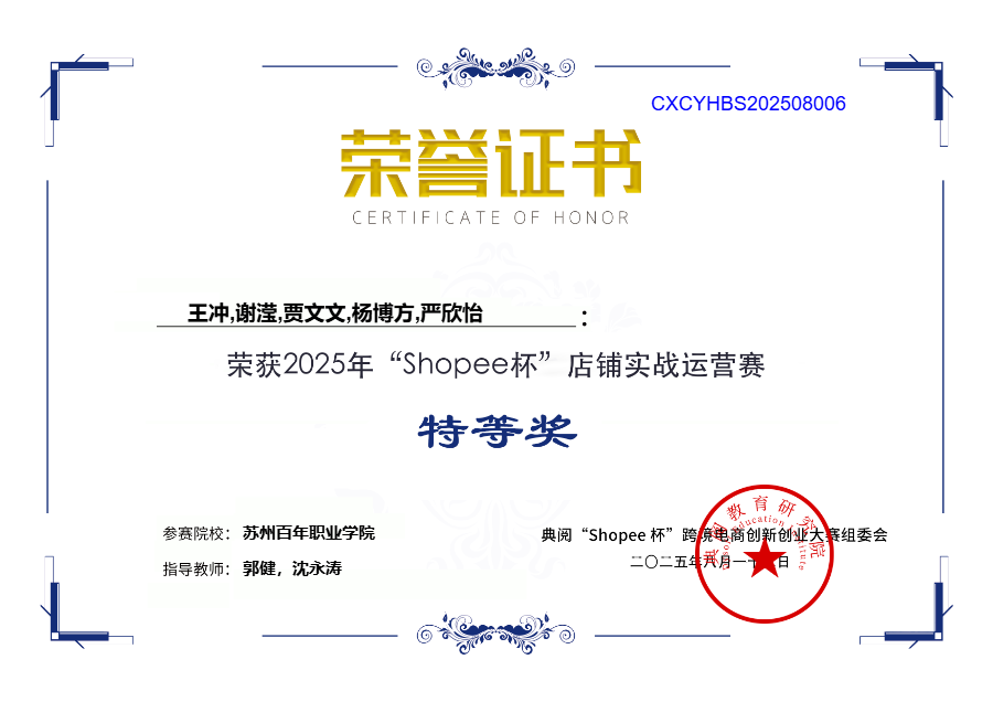 2025“Shopee杯”跨境电商创新创业大赛全国总决赛落幕。我校数字经济与管理学院表现亮眼,三支代表队均成功入围全国总决赛,最终斩获多项重量级奖项:“苏州百年职业二队”以全国第六名的实战业绩荣获“店铺实战运营”赛道特等奖;“苏州百年职业一队”在“全流程模拟运营及数据分析”赛道中斩获三等奖;同时,两队亦在“全流程模拟运营及数据分析”赛道中收获优秀奖。