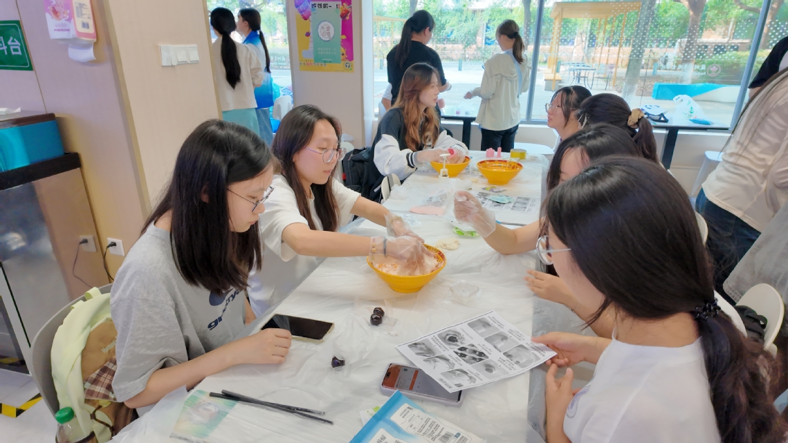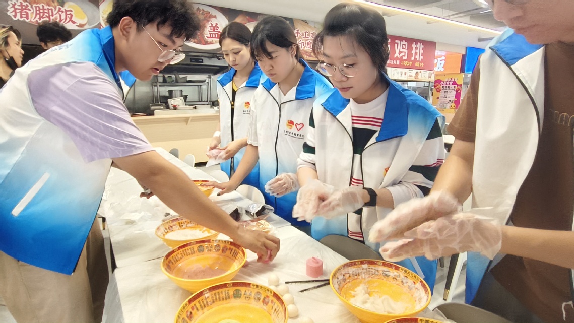 活动现场温馨有序,志愿者们提前备好了冰皮预拌粉、丰富馅料及各式创意模具。活动伊始,志愿者详细演示了从揉制面团、称重馅料到压模成型的每一个步骤,讲解细致、操作清晰。同学们纷纷动手实践,揉面、擀皮、包馅、压模,动作由生疏渐至熟练。在互帮互助的氛围中,探讨声、欢笑声与模具清脆的脱模声此起彼伏,食堂化身为充满创意与温情的工坊。
