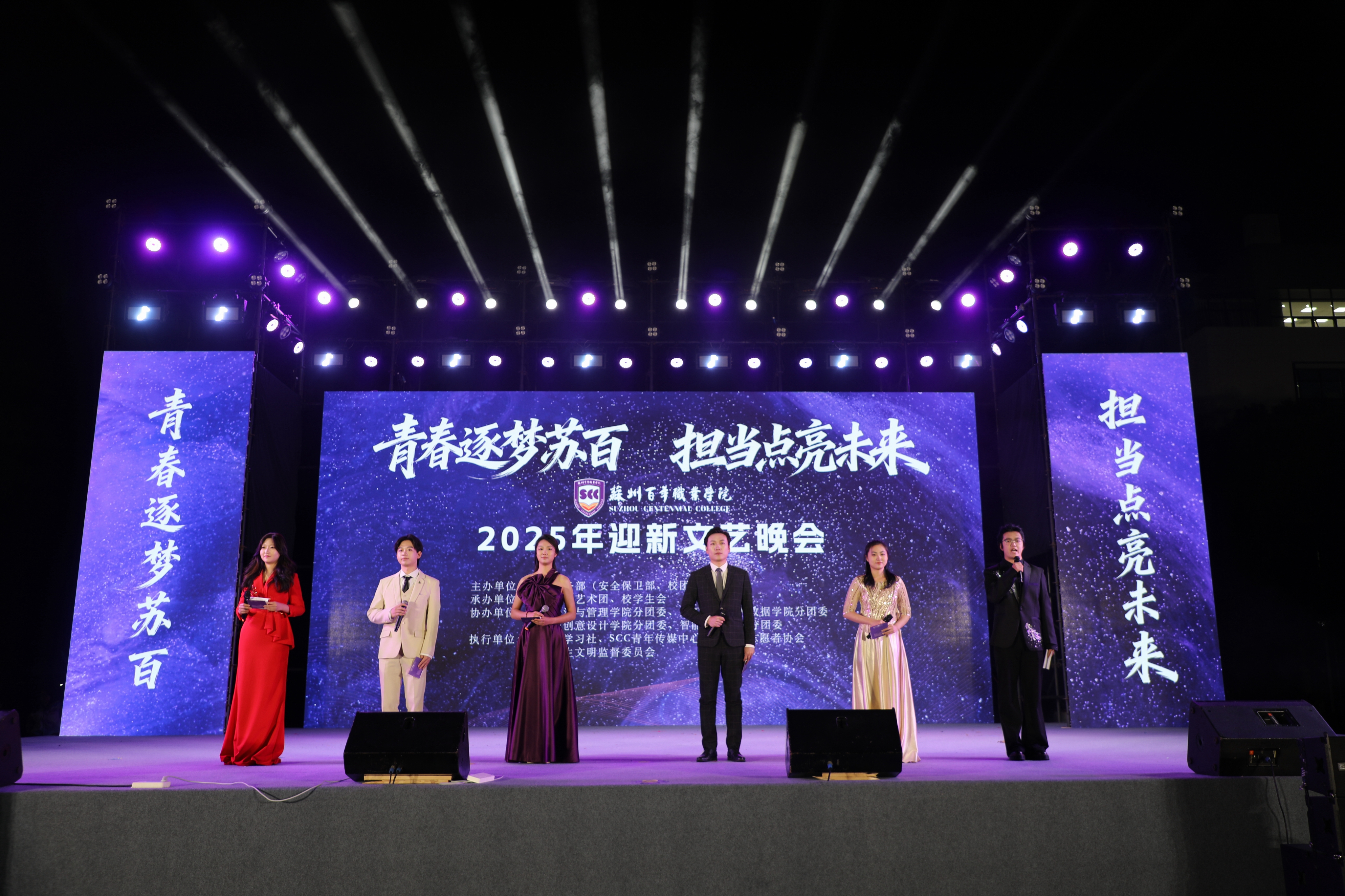 11月5日晚,我校“青春逐梦苏百,担当点亮未来”2025年迎新晚会在运动场精彩上演,晚会通过四个篇章为全体新生呈现了一场精彩纷呈的文艺盛宴。校长李世明、党委书记孙红军、党委副书记鲁伟、副校长张丽、校长助理侯玉杰、校长助理袁祥及各二级单位负责人、全体辅导员和2025级全体新生共同观看演出。