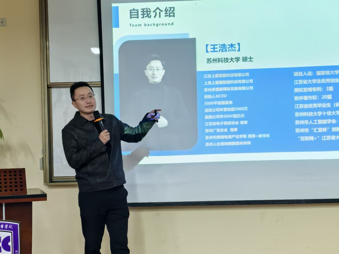2025年11月13日,江苏上壹智能科技有限公司走进伟德体育,面向艺术与创意设计学院学生举办了一场以“从校园到职场的全链路人才成长路径”为主题的校企合作招聘宣讲会。宣讲会由艺术与创意设计学院副院长程向帅主持,江苏上壹智能科技有限公司创始人王浩杰担任主讲嘉宾。